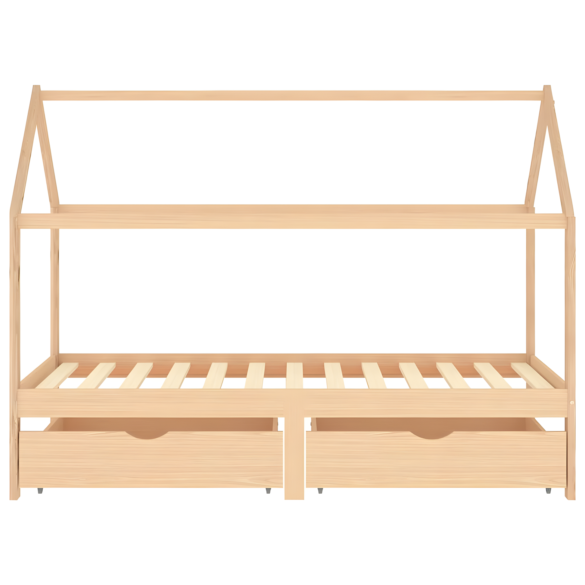 Sa structure en bois de pin massif apporte une base solide, tandis que le format cabane permet de créer un espace plus enveloppant avec des rideaux. Les tiroirs intégrés facilitent le rangement du quotidien, sans alourdir l’ensemble.